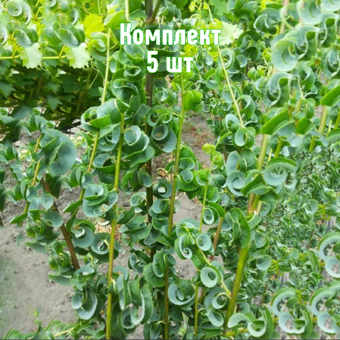 Саженцы ивы Криспа — набор из 5 растений по цене четырёх. Низкорослый декоративный кустарник до 2 м с конусовидной кроной и тонкими блестящими побегами оттенков от красноватого до жёлто‑зёлёного. Листва закручена в спирали, ланцетная, глянцевая (примерно 10×2,5 см), верх тёмно‑зелёный, низ сизоватый; у молодых растений может быть лёгкий пушок. Цветёт в апреле–мае тонкими сережками жёлто‑зелёных тонов с лёгким ароматом.
