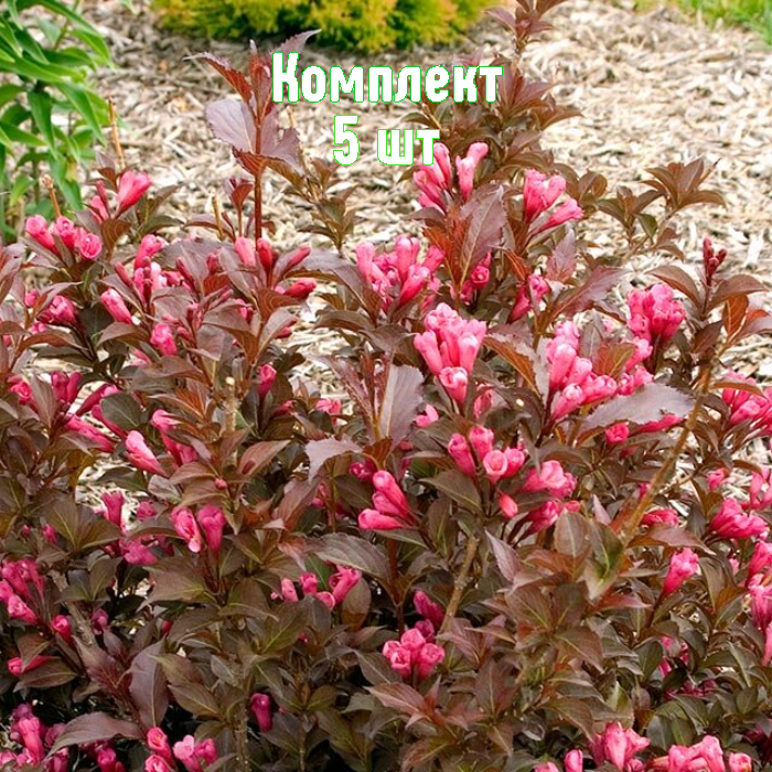 Набор из 5 саженцев вейгелы пестролистной Cappuccino — выгодное предложение: 5 шт. по цене 4. Морозостойкий декоративный листопадный кустарник с прямыми стволиками и элегантно раскидистыми побегами. На ветвях раскрываются крупные розовые цветы с контрастной красной чашечкой, крона меняет оттенки от жёлто-зелёного молодых побегов до оливково-коричневых тонов взрослой листвы.